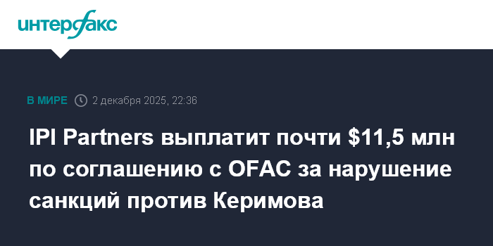Москва. 2 декабря. INTERFAX.RU - Компания IPI Partners, LLC выплатит штраф в размере $11,485 млн, урегулировав тем самым претензии OFAC (Office of Foreign Assets Control, подразделение Минфина США, отвечающее за правоприменение в области санкций).