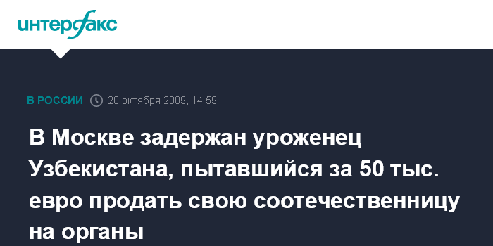 О том, что гражданин предлагает живого человека в качестве донора органов, сотрудникам УВД Юго-Западного округа стало известно, когда они расследовали другое уголовное дело". 29-летний уроженец Ташкента, представлявшийся директором модельного агентства, попытался продать на органы свою 18-летнюю соотечественницу.
