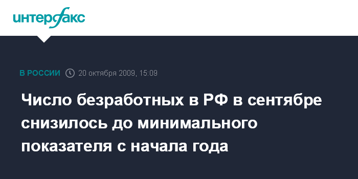 Число безработных в конце сентября стало минимальным с начала года (на начало года число безработных равнялось 5,895 млн человек), но превышало показатель сентября 2008 года на 1 млн человек (в сентябре 2008 года - 4,744 млн человек).
