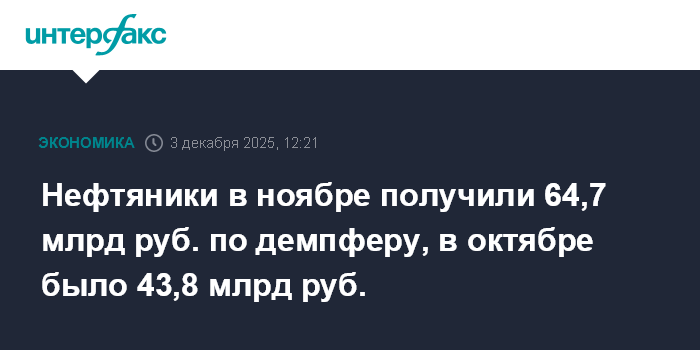Нефтяники в ноябре получили 64,7 млрд руб. по демпферу, в октябре было 43,8 млрд руб.