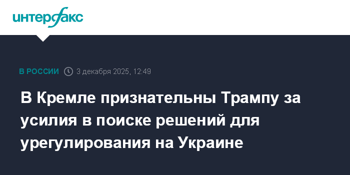 Москва. 3 декабря. INTERFAX.RU - В Кремле высоко ценят усилия президента США Дональда Трампа и его администрации по поиску решения для мирного урегулирования ситуации на Украине, заявил пресс-секретарь президента России Дмитрий Песков.
