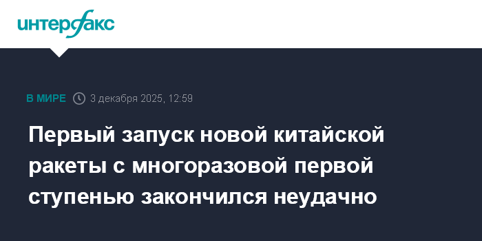 Москва. 3 декабря. INTERFAX.RU - Первый испытательный пуск ракеты-носителя "Чжуцюэ-3" (Zhuque-3 - ZQ-3) с многоразовой первой ступенью китайской частной компании LandSpace Technology закончился неудачей, заявила компания.