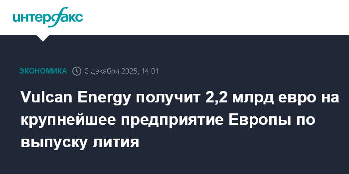 Москва. 3 декабря. INTERFAX.RU - Горнодобывающая компания Vulcan Energy Resources заручилась финансированием в размере 2,2 млрд евро на строительство первой фазы литиевого проекта Lionheart в Германии.