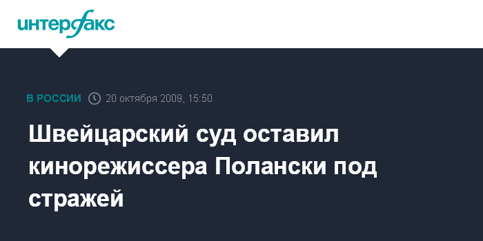 Москва. 20 октября. INTERFAX.RU - Верховный криминальный суд Швейцарии оставил в силе решение нижестоящей инстанции о сохранении кинорежиссеру Роману Полански меры пресечения в виде содержания под стражей, сообщает во вторник британская телерадиокорпорация ВВС.