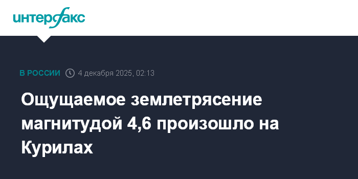Ощущаемое землетрясение магнитудой 4,6 произошло на Курилах