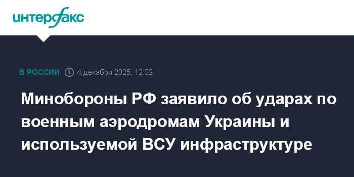 Москва. 4 декабря. INTERFAX.RU - Российские военные за минувшие сутки нанесли удары по украинским военным аэродромам, объектам транспортной и энергетической инфраструктуры, используемым для нужд вооруженных сил Украины, сообщили в Минобороны РФ в четверг.