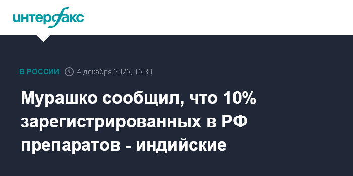 Москва. 4 декабря. INTERFAX.RU - Порядка 10% зарегистрированных в России лекарственных препаратов индийские, это 1,8 тыс. единиц, сообщил министр здравоохранения РФ Михаил Мурашко.