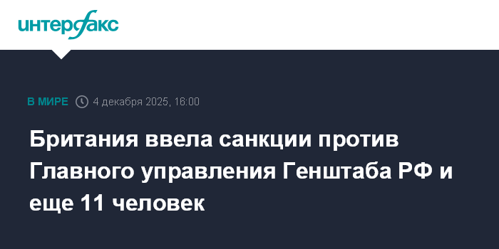 Москва. 4 декабря. INTERFAX.RU - Британские власти приняли решение ввести санкции против Главного управления Генштаба ВС РФ и еще 11 физических лиц, говорится в пресс-релизе правительства страны.