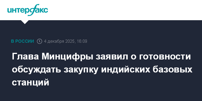 Москва. 4 декабря. INTERFAX.RU - Россия готова обсуждать выход индийских производителей базовых станций (БС) на российский рынок, а также размещать в Индии производство различного электронного оборудования, заявил глава Минцифры РФ Максут Шадаев в ходе российско-индийского бизнес-форума.