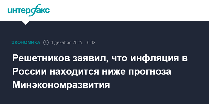 Москва. 4 декабря. INTERFAX.RU - Траектория инфляции в РФ идет существенно ниже, чем официальный прогноз Минэкономразвития на 2025 год, заявил журналистам в кулуарах российско-индийского бизнес-форума глава министерства Максим Решетников.