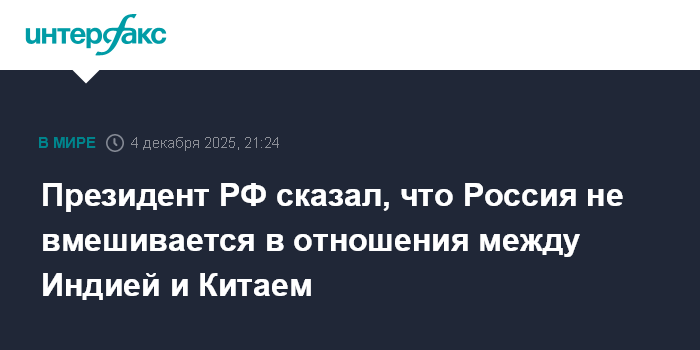 "Индия и Китай - наши самые близкие друзья, мы этим очень дорожим, и мы не считаем себя вправе вмешиваться в двусторонние отношения между Индией и Китаем", - сказал Путин в интервью телеканалам Aaj Tak и India Today, опубликованном на сайте Кремля.