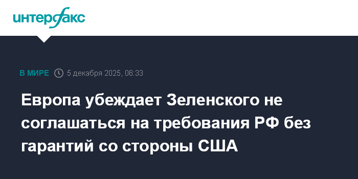 Москва. 5 декабря. INTERFAX.RU - Европейские лидеры в беседах с президентом Украины Владимиром Зеленским пытаются убедить его, что не следует соглашаться на требования России без твердых обязательств по обеспечению безопасности со стороны США, сообщает The Wall Street Journal со ссылкой на источники.