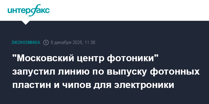 Москва. 5 декабря. INTERFAX.RU - ООО "Московский центр фотоники" (ОЭЗ "Технополис", Зеленоград) ввело в строй комплекс по выпуску фотонных интегральных схем (ФИС) проектной мощностью до 2 тыс. производственных пластин в год и до 500 тыс. фотонных чипов в зависимости от топологии и функционального назначения, сообщил Минпромторг РФ.