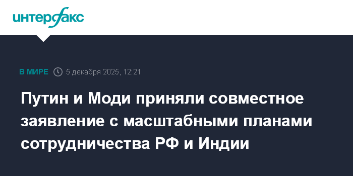 Москва. 5 декабря. INTERFAX.RU - Президент РФ Владимир Путин и премьер-министр Индии Нарендра Моди приняли совместное заявление, в котором отражены масштабные планы двустороннего сотрудничества на перспективу в политике, безопасности, экономике, энергетике и других сферах.