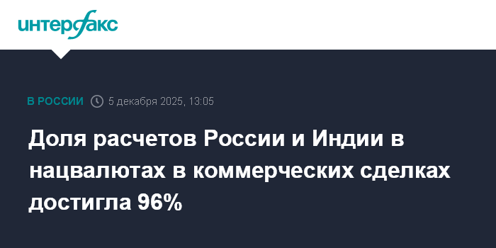 Доля расчетов России и Индии в нацвалютах в коммерческих сделках достигла 96%