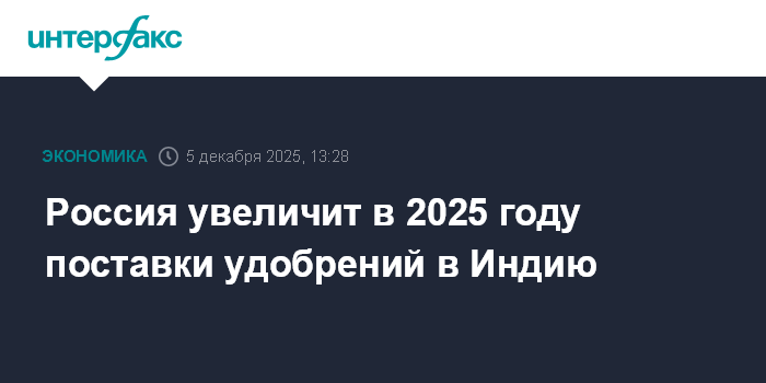 Москва. 5 декабря. INTERFAX.RU - Россия в 2025 году планирует поставить в Индию более 5 млн тонн удобрений, сообщил журналистам глава Российской ассоциации производителей удобрений (РАПУ) Андрей Гурьев.