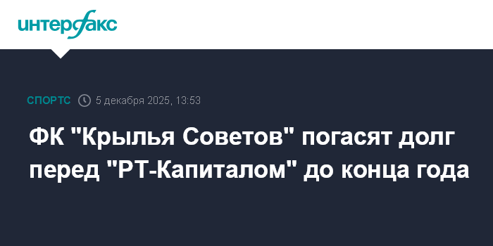 Москва. 5 декабря. INTERFAX.RU - Самарский футбольный клуб "Крылья Советов" планирует погасить долг перед ООО "РТ-Капитал" (входит в госкорпорацию "Ростех") до конца 2025 года, сообщил на "прямой линии" губернатор Самарской области Вячеслав Федорищев .