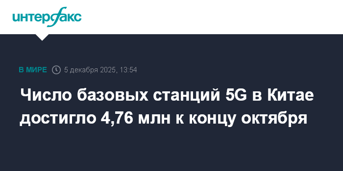 Москва. 5 декабря. INTERFAX.RU - Количество базовых станций сетей связи нового поколения 5G в Китае на конец октября достигло почти 4,76 млн, сообщило министерство промышленности и информатизации.