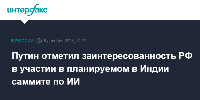 Москва. 5 декабря. INTERFAX.RU - Россия заинтересована принять участие в саммите по искусственному интеллекту, который планируется в Индии в феврале 2026 года, туда будет направлена представительная делегация, заявил президент РФ Владимир Путин.
