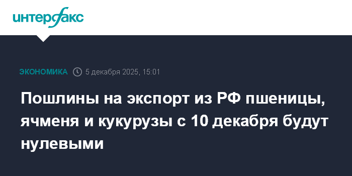 Пошлины на экспорт из РФ пшеницы, ячменя и кукурузы с 10 декабря будут нулевыми