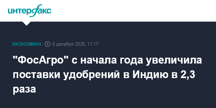 Москва. 5 декабря. INTERFAX.RU - "ФосАгро" за 11 месяцев 2025 года увеличила поставки удобрений в Индию в 2,3 раза к аналогичному периоду прошлого года, до 2,57 млн тонн, сообщил через пресс-службу генеральный директор компании Александр Гильгенберг.