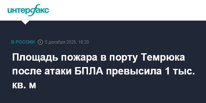 Москва. 5 декабря. INTERFAX.RU - Площадь пожара в порту Темрюка после ночной атаки БПЛА на город составляет 1,35 тыс. квадратных метров, сообщил оперативный штаб региона.