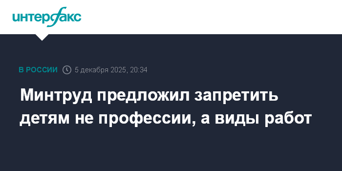 "Минтруд России предложил усовершенствовать подходы к охране труда несовершеннолетних. В частности, предлагается выделить перечень работ, при выполнении которых запрещен труд несовершеннолетних. Текущая модель, когда в перечне поименованы профессии, позволяет обходить запрет через изменение наименования должности", - сказали в пресс-службе ведомства.