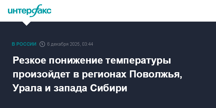 Москва. 6 декабря. INTERFAX.RU - Температура в регионах Приволжского, Уральского и Сибирского федеральных округов понизится в начале следующей недели, в отдельных регионах температура упадет сразу на 25 градусов, сообщил "Интерфаксу" научный руководитель Гидрометцентра России Роман Вильфанд.
