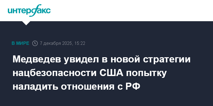 Медведев отмечает, что "впервые за много лет наша страна в американском документе названа не "угрозой", а участником диалога о стабильности". "Примечательно, что речь об остановке расширения НАТО там идет, а Украина в этом контексте не фигурирует вовсе. Стратегия неожиданно рифмуется с тем, о чем мы говорим уже не один год: безопасность должна быть общей, а суверенитет государств необходимо уважать. Россия давно предлагала договариваться, а не с задранным кверху носом навязывать миру порядок, основанный на правилах, которые даже не зафиксированы в международном праве. Теперь же форточка возможностей для диалога приоткрыта", - говорится в его сообщении.
