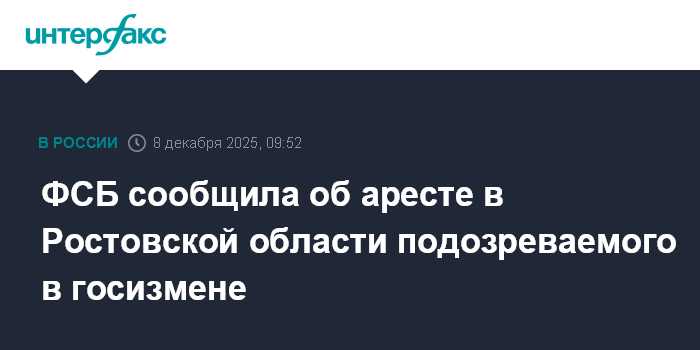 ФСБ сообщила об аресте в Ростовской области подозреваемого в госизмене