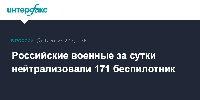 Москва. 8 декабря. INTERFAX.RU - Российские средства ПВО в течение суток сбили 171 украинский беспилотный летательный аппарат самолетного типа.