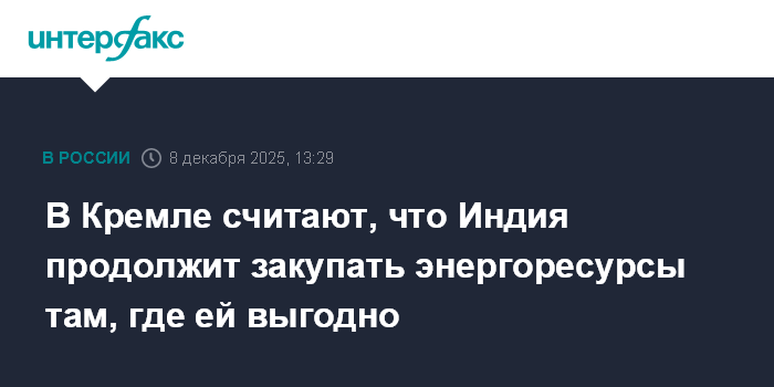 Москва. 8 декабря. INTERFAX.RU - Пресс-секретарь президента РФ Дмитрий Песков выразил мнение, что Индия продолжит закупать энергоресурсы там, где ей выгодно.