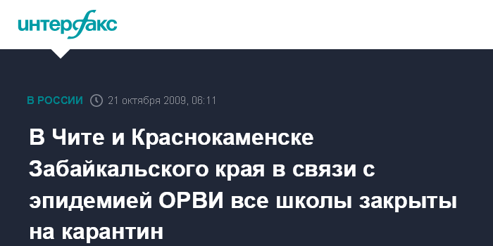 Чита. 21 октября. ИНТЕРФАКС-СИБИРЬ - В двух городах Забайкальского края - Чите и Краснокаменске в связи с эпидемией ОРВИ и гриппа все школы закрыты на карантин, а массовые мероприятия запрещены.