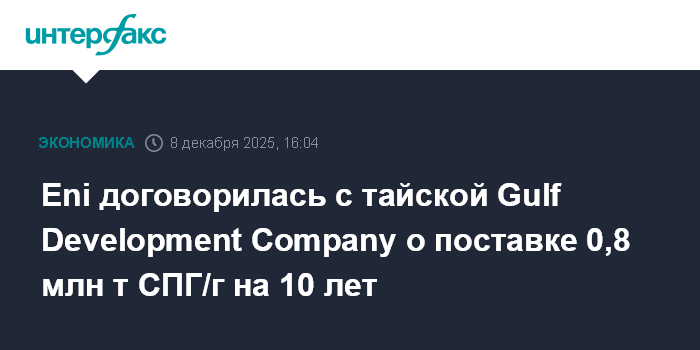 Как сообщила Eni, она обязуется продавать 0,8 млн тонн СПГ в год в течение 10 лет компании Gulf, одному из крупнейших частных производителей электроэнергии в Таиланде. Энергоноситель будет отгружаться на регазификационные терминалы в стране с 2027 года.