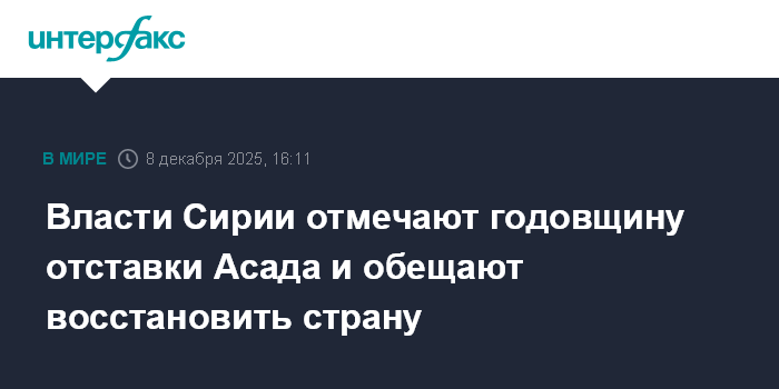 Москва. 8 декабря. INTERFAX.RU - Президент Сирии на переходный период Ахмед аш-Шараа по случаю первой годовщины отставки экс-президента Башара Асада заверил население в намерении восстановить страну, сообщает в понедельник агентство SANA.