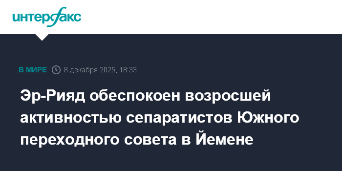 Москва. 8 декабря. INTERFAX.RU - Саудовская Аравия добилась временного закрытия воздушного пространства над Йеменом, чтобы повлиять на поддерживаемый ОАЭ сепаратистский Южный переходный совет, который взял под контроль ряд важных территорий Йемена, сообщает AP cо ссылкой на источник.