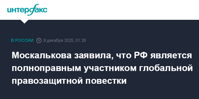 Москва. 9 декабря. INTERFAX.RU - Россия остается полноправным участником глобальной правозащитной повестки, при этом сохранены каналы взаимодействия и с европейскими коллегами, заявила уполномоченный по правам человека в РФ Татьяна Москалькова.