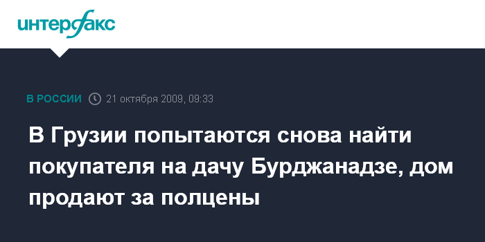 Москва. 21 октября. INTERFAX.RU - В Тбилиси в очередной раз попытаются продать дачу, ранее принадлежавшую экс-спикеру парламента, лидеру оппозиционной партии "Демократическое движение - единая Грузия" Нино Бурджанадзе.