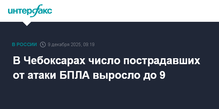 Москва. 9 декабря. INTERFAX.RU - В Чебоксарах число пострадавших в результате атаки БПЛА, по оперативным данным, выросло до 9 человек, сообщил вице-губернатор Чувашии Владимир Степанов.