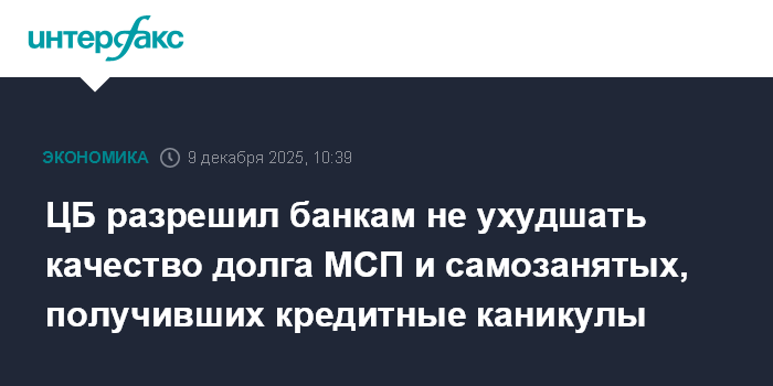 Москва. 9 декабря. INTERFAX.RU - ЦБ РФ разрешил банкам при формировании резервов не ухудшать качество обслуживания кредитов малым и средним предприятиям (МСП) и самозанятым, получившим кредитные каникулы.