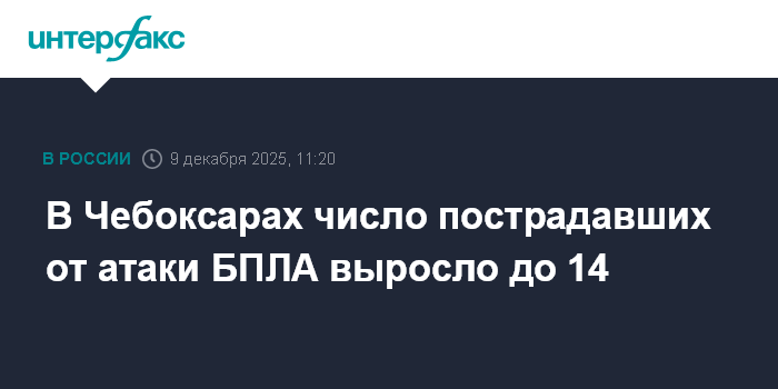 Москва. 9 декабря. INTERFAX.RU - В Чебоксарах количество пострадавших в результате атаки БПЛА увеличилось до 14 человек, сообщил вице-премьер Чувашии Владимир Степанов во вторник.