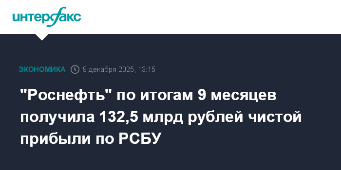 Москва. 9 декабря. INTERFAX.RU - Чистая прибыль "Роснефти" по РСБУ по итогам января-сентября 2025 года составила 132 млрд рублей против 389 млрд рублей годом ранее, сообщается в отчете компании.