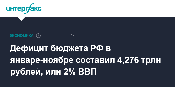 Москва. 9 декабря. INTERFAX.RU - Федеральный бюджет РФ в январе-ноябре 2025 года, по предварительным данным, был исполнен с дефицитом 4,276 трлн рублей, или 2% ВВП, сообщил Минфин.