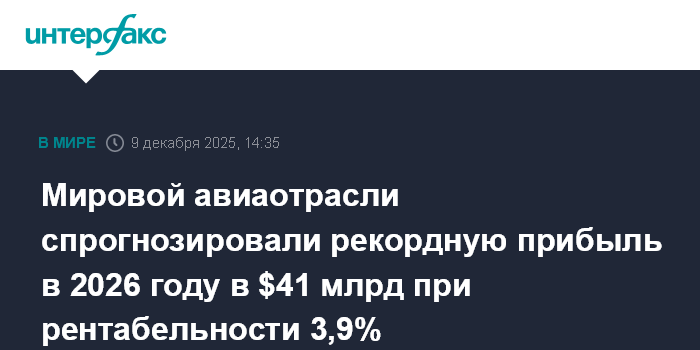 Москва. 9 декабря. INTERFAX.RU - Совокупная чистая прибыль мировой авиаотрасли в 2026 году может составить $41 млрд, что на 3,8% превысит прибыль, ожидаемую по итогам 2025 года, и станет новым рекордом для этого показателя, спрогнозировала Международная ассоциация воздушного транспорта (IATA).