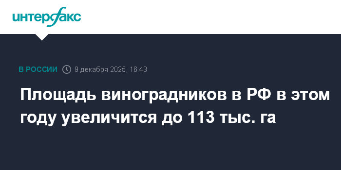 Москва. 9 декабря. INTERFAX.RU - Площадь виноградников в России в последние годы постоянно расширяется, в этом году она достигнет 113 тыс. га, сообщила первый замминистра сельского хозяйства Елена Фастова на пресс-конференции, приуроченной к презентация очередного "Винного гида России".