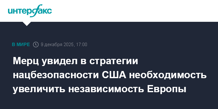 Москва. 9 декабря. INTERFAX.RU - Новая стратегия национальной безопасности США дает понять Европе, что ей пора вести более независимую политику, заявил канцлер Германии Фридрих Мерц. Об этом сообщает АР.