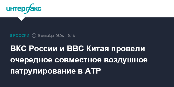 Москва. 9 декабря. INTERFAX.RU - Воздушно-космические силы России и ВВС Народно-освободительной армии Китая провели очередное совместное воздушное патрулирование в Азиатско-Тихоокеанском регионе, сообщает министерство обороны РФ.
