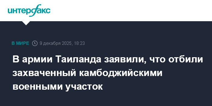 Москва. 9 декабря. INTERFAX.RU - Тайские войска во вторник в ходе боестолкновений освободили приграничный участок территории в провинции Са Каео, захваченный ранее камбоджийскими военными, сообщила Первая армия Таиланда.