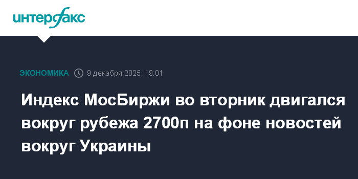 Москва. 9 декабря. INTERFAX.RU - Российский рынок акций во вторник провел волатильные торги на фоне поступающих геополитических новостей вокруг процесса мирного урегулирования военного конфликта на Украине, фактором давления выступила просевшая нефть (фьючерс на Brent опустился ниже $62 за баррель). Индекс МосБиржи в течение дня двигался вокруг рубежа 2700 пунктов, но завершил торги выше этой отметки.