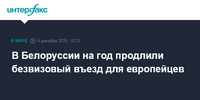 Москва. 9 декабря. INTERFAX.RU - Действующий в Белоруссии безвизовый въезд для граждан европейских стран продлен до конца 2026 года, сообщила во вторник президентская пресс-служба.